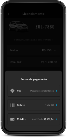 Consulte o valor e pague a taxa de licenciamento em SP, PR, SC e RJ com o app Zul+ com Pix ou em até 12x.